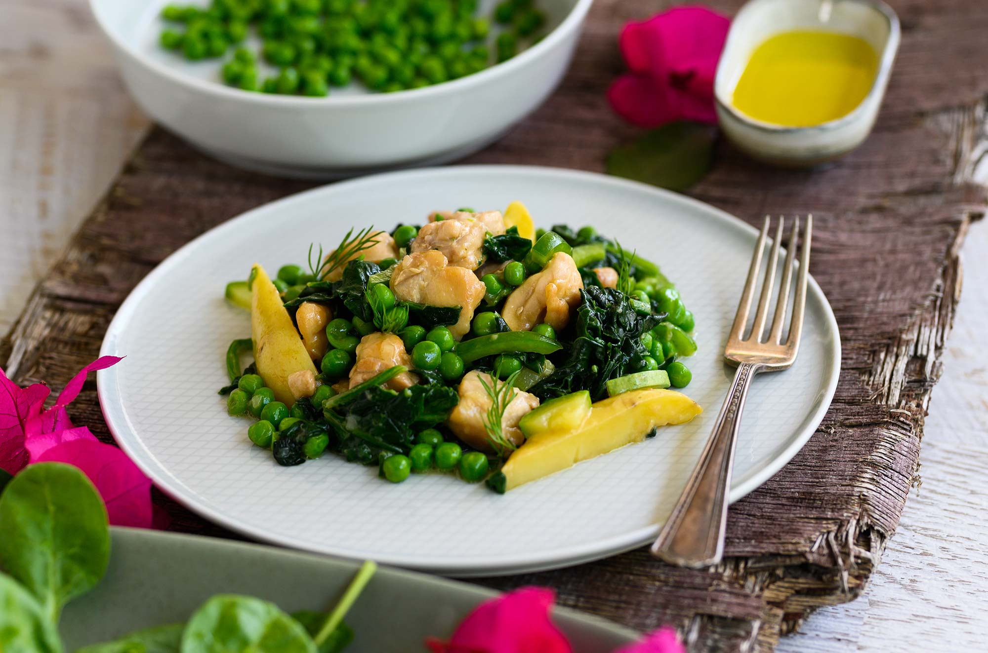 Αρακάς λεμονάτος με φιλέτο μπούτι κοτόπουλο και πράσινα λαχανικά