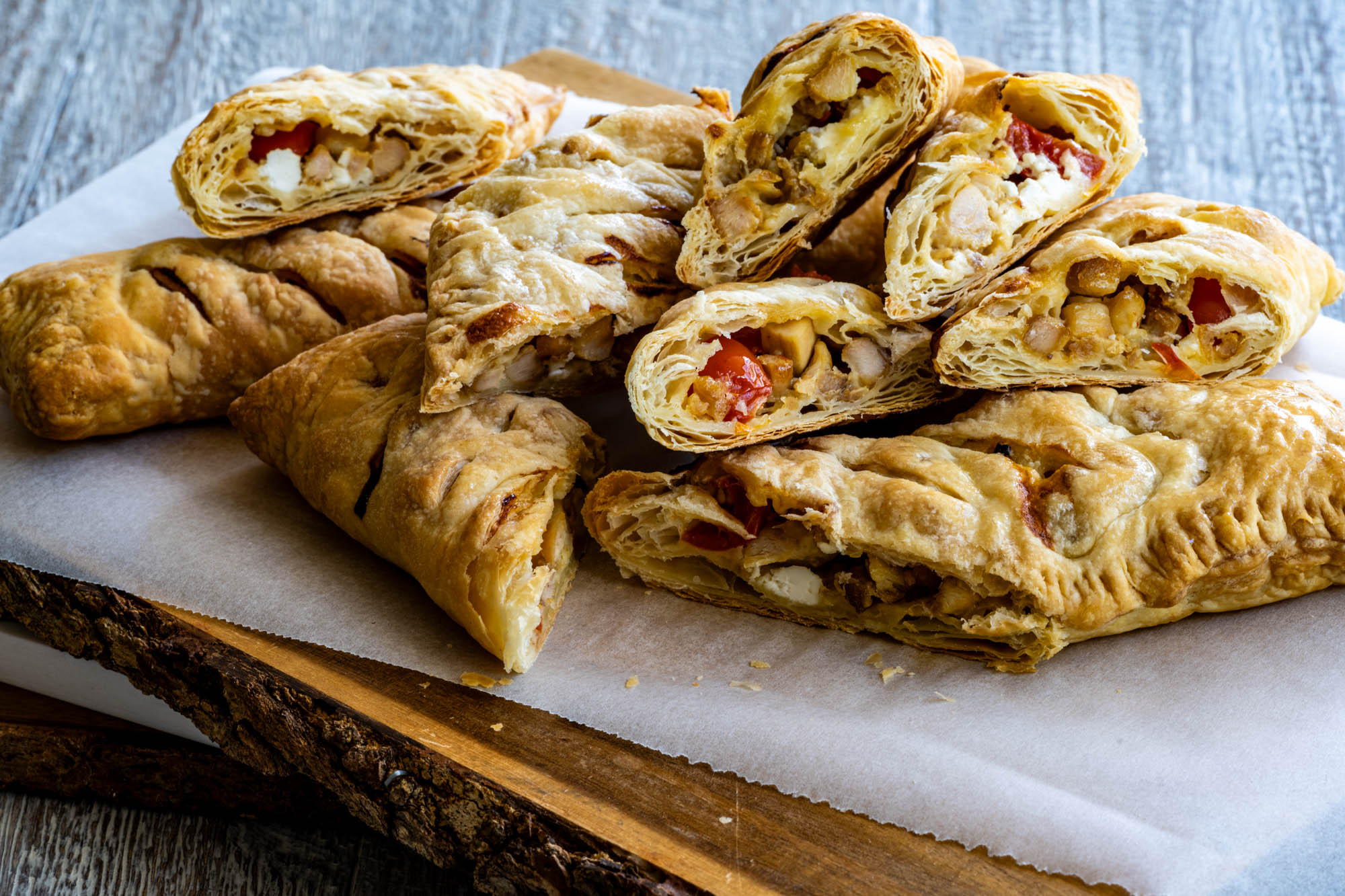 Απλώνετε ομοιόμορφα το μείγμα στην μακριά μεριά του κάθε κομματιού, αφήνοντας περιμετρικά τα γέμισης περίπου 1 δάχτυλο σφολιάτας, το οποίο περνάτε με λίγο νερό.