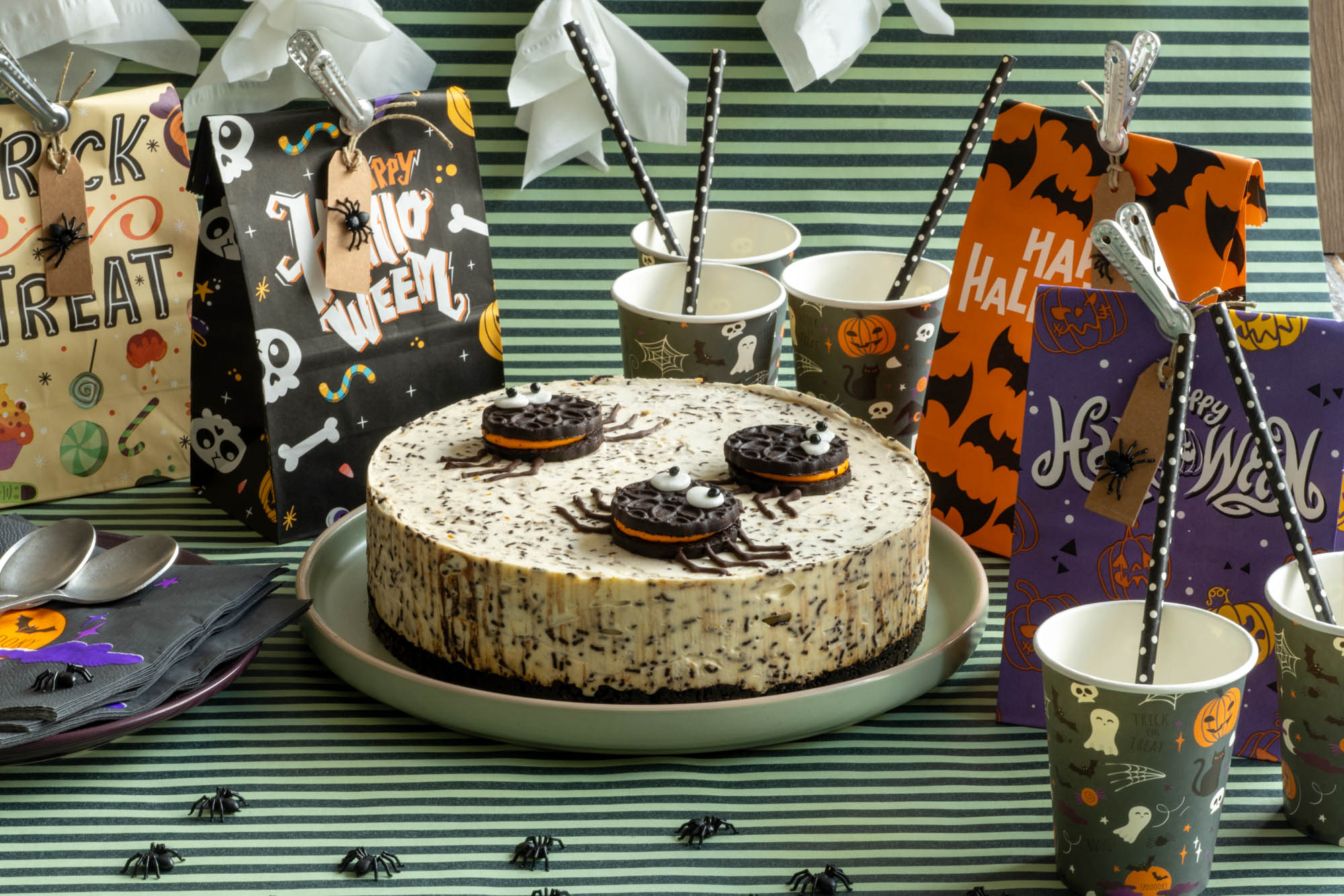 Τοποθετούμε τα ολόκληρα μπισκότα πάνω στο cheesecake και με την κουβερτούρα σχηματίζουμε 3 πόδια αράχνης σε κάθε πλευρά των μπισκότων.