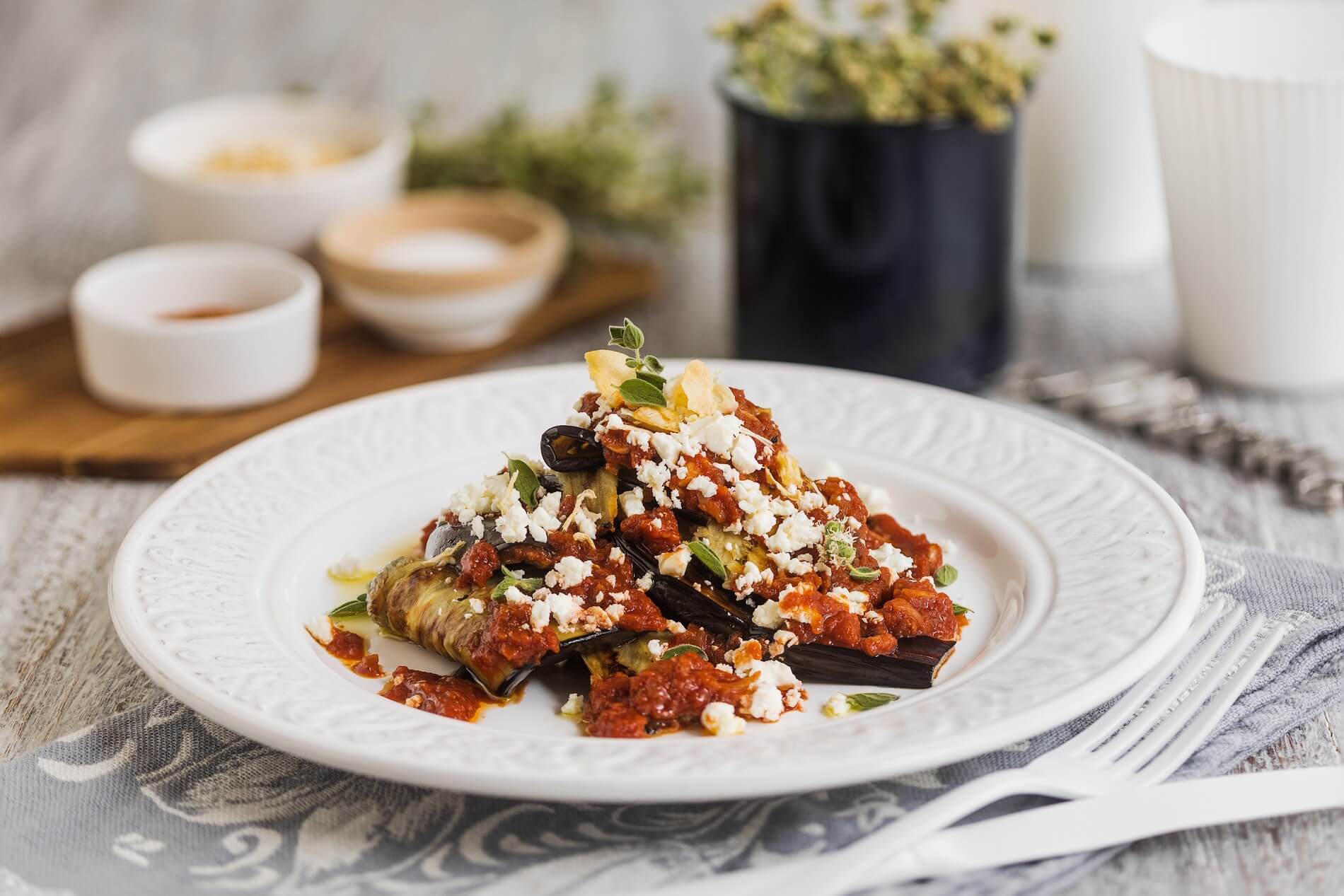 Όταν η σάλτσα είναι έτοιμη την περιχύνετε πάνω από τις μελιτζάνες, πασπαλίζετε με την χοντροσπασμένη φέτα, την φρέσκια ψιλοκομμένη ρίγανη, περιχύνετε με λίγο ελαιόλαδο και σερβίρετε.