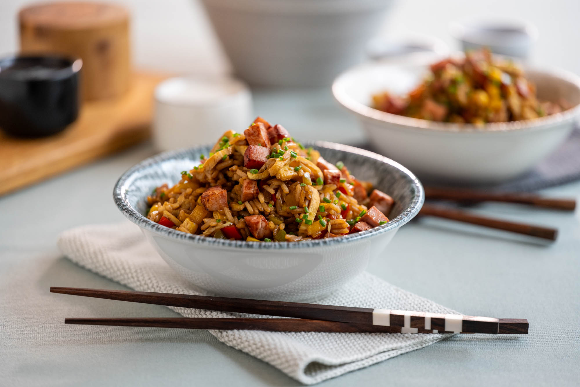 Σοτάρετε το ψητό ζαμπόν μαζί με τις πιπεριές για 3-4 λεπτά, προσθέτετε το καλαμπόκι, το τζίντζερ, τα φρέσκα κρεμμυδάκια, την ψιλοκομμένη ομελέτα, το ρύζι jasmine και την σόγια σος και συνεχίζετε το μαγείρεμα για άλλα 1-2 λεπτά.