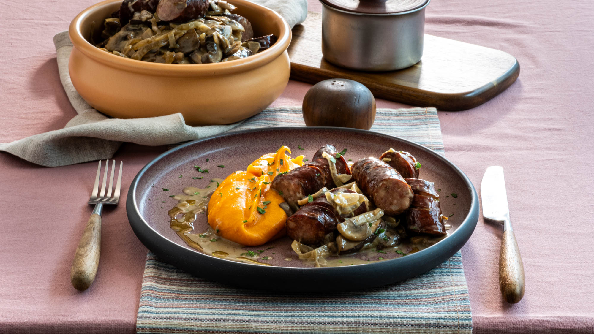 Σερβίρετε σε μεγάλα, ατομικά πιάτα τον πουρέ γλυκοπατάτας με τα κρασάτα λουκάνικα από πάνω.
