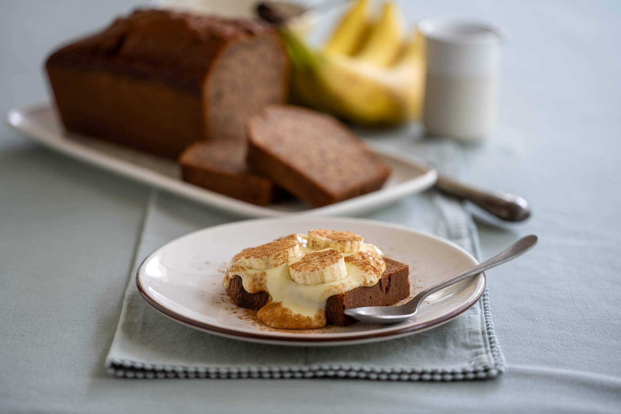 Bananabread με πουτίγκα βανίλιας και φέτες μπανάνας