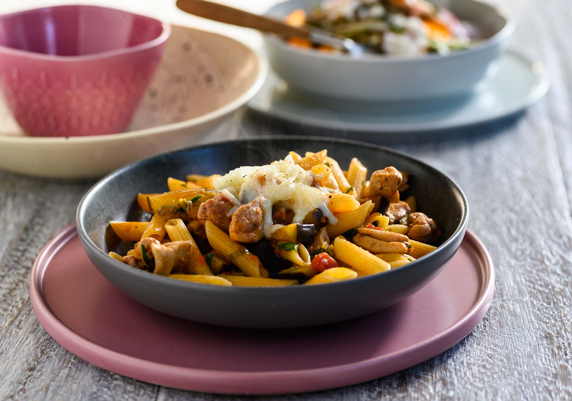 Penne rigate με φιλέτο μπούτι κοτόπουλο, μελιτζάνα, σκόρδο, σάλτσα τομάτας και κασέρι