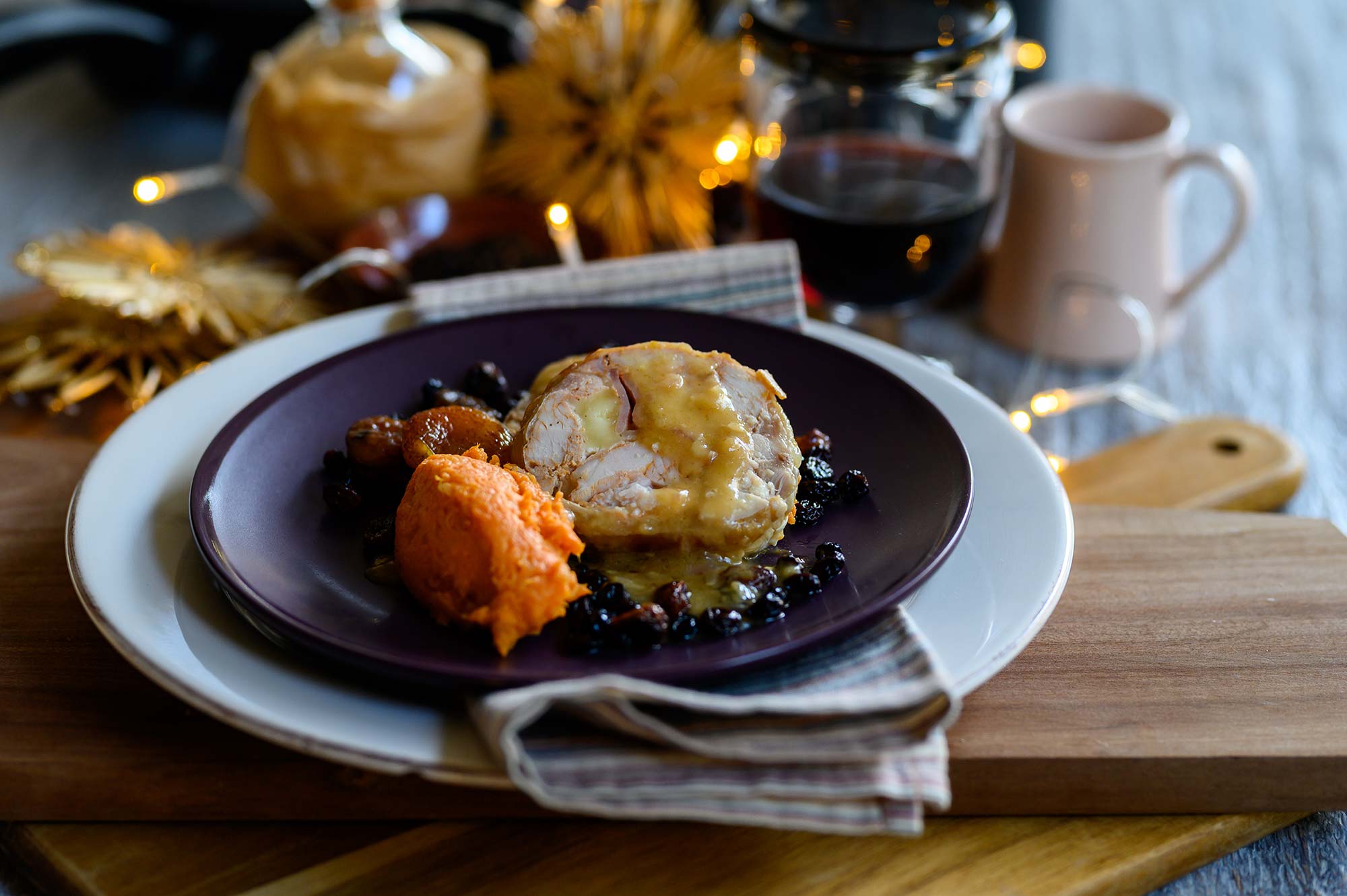 Σερβίρετε σε μεγάλα ατομικά πιάτα τον πουρέ γλυκοπατάτας, από πάνω το ρολό κοτόπουλο, την σάλτσα του κοτόπουλου και τέλος τα σοταρισμένα κάστανα.