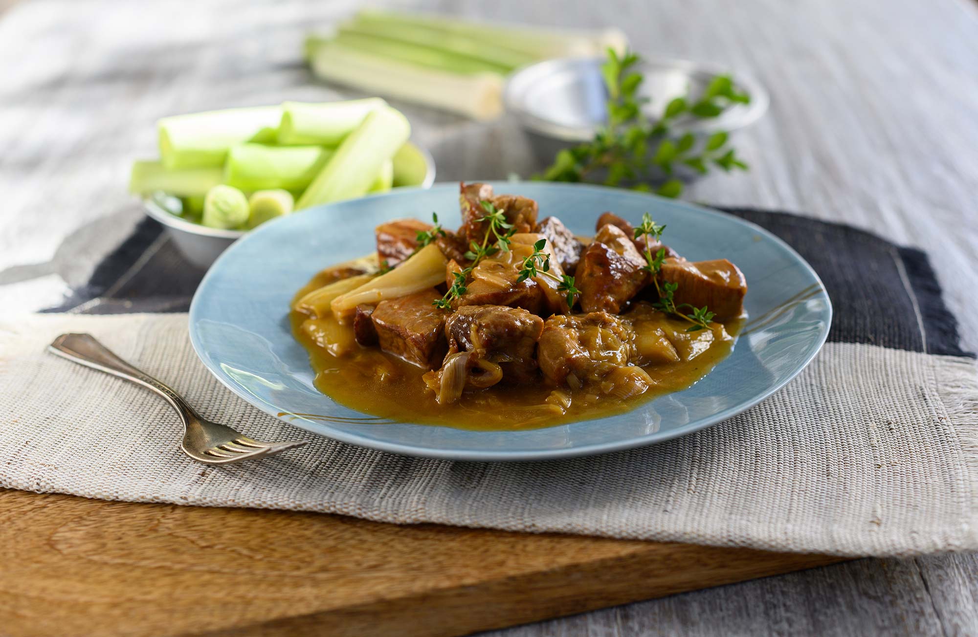 Όταν χοιρινό είναι έτοιμο και η σάλτσα έχει δέσει, προσθέτετε το ψιλοκομμένο θυμάρι, ανακατεύετε μία τελευταία φορά, αποσύρετε από την φωτιά και σερβίρετε.